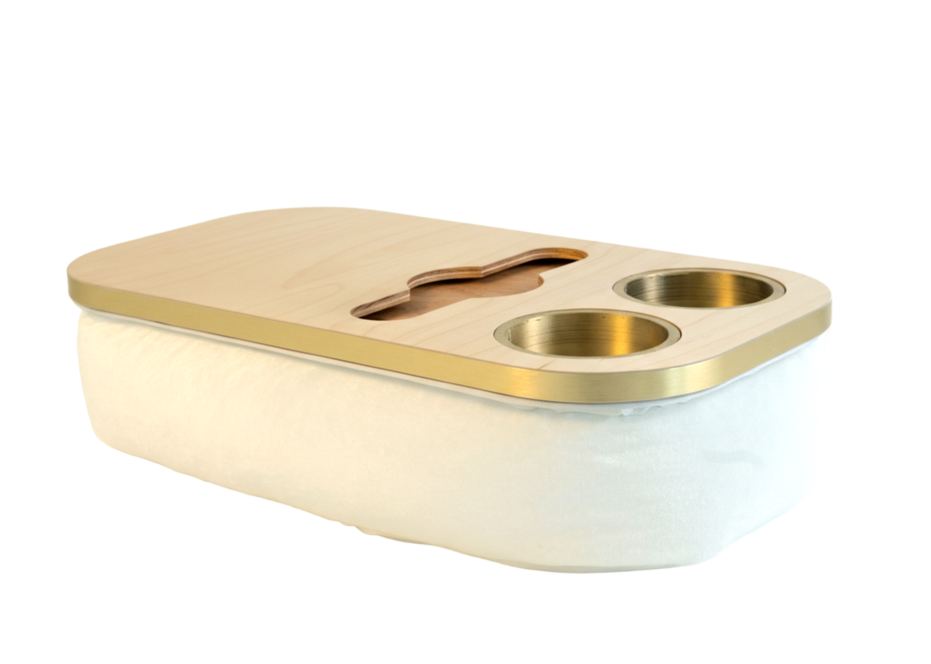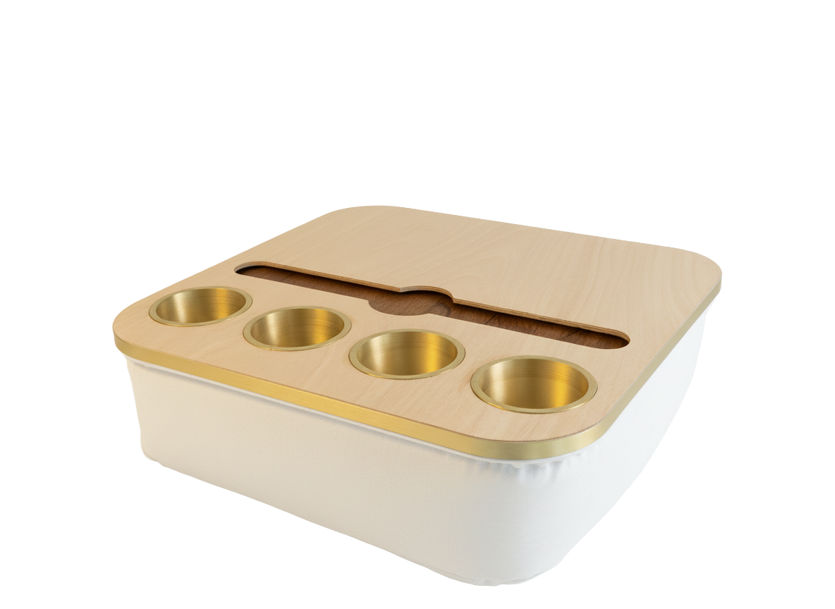 Each tray features a sleek birch wood tabletop that has a non-slip, UV coating to help protect against splashes and spills. It is paired with a stable, cushioned beanbag base that conforms gently to most surfaces. Metallic cupholders are available in gold or silver for a refined finish.