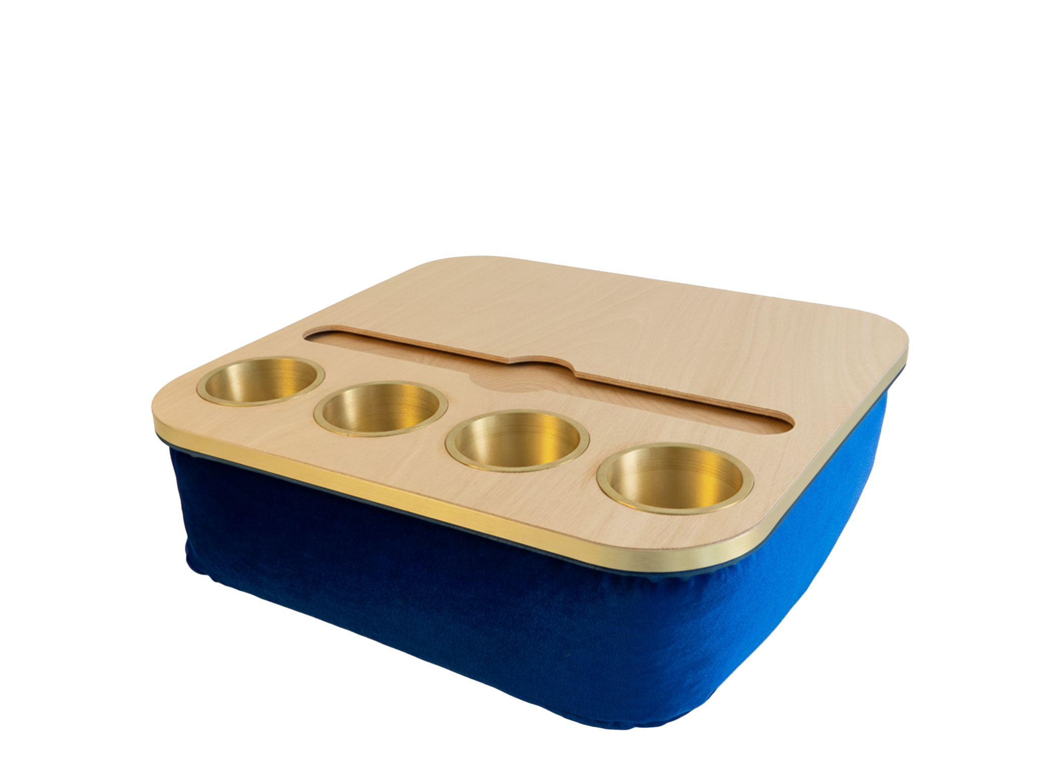 Blending elegance with practicality, the Duo Tray features a beanbag base that adapts to most surfaces, keeping drinks and snacks comfortably within reach. Its anti-slip coated top, metallic gold or silver cupholders, and patented stemware rail create a stable, refined experience that enhances every moment of relaxation.