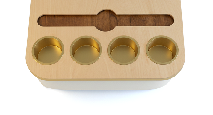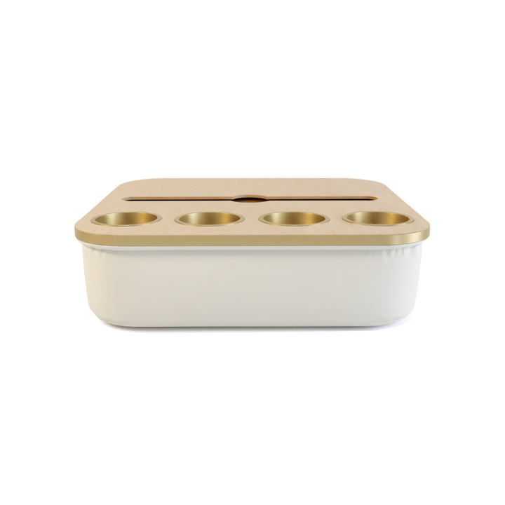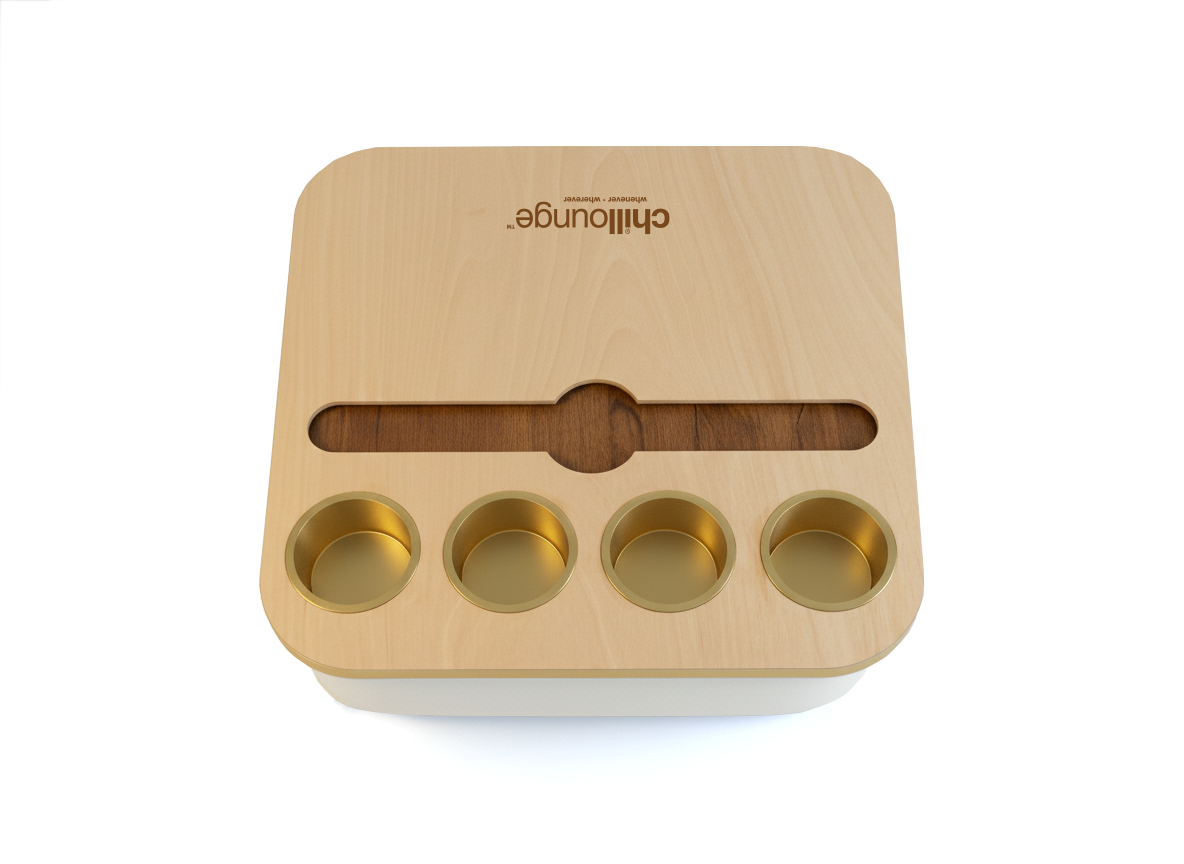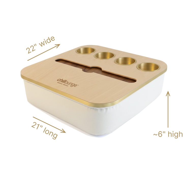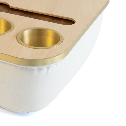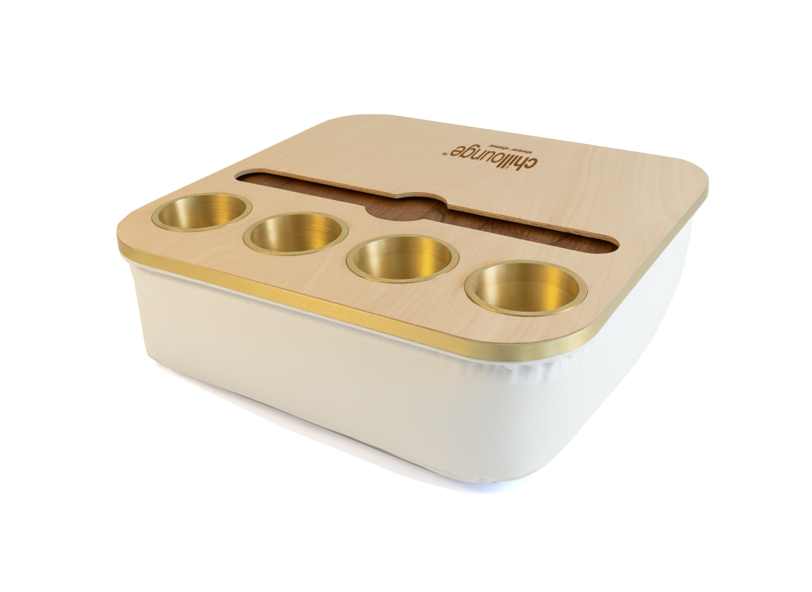 Blending elegance with practicality, the Duo Tray features a beanbag base that adapts to most surfaces, keeping drinks and snacks comfortably within reach. Its anti-slip coated top, metallic gold or silver cupholders, and patented stemware rail create a stable, refined experience that enhances every moment of relaxation.