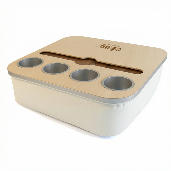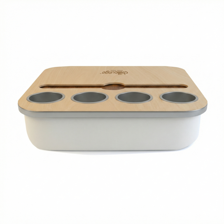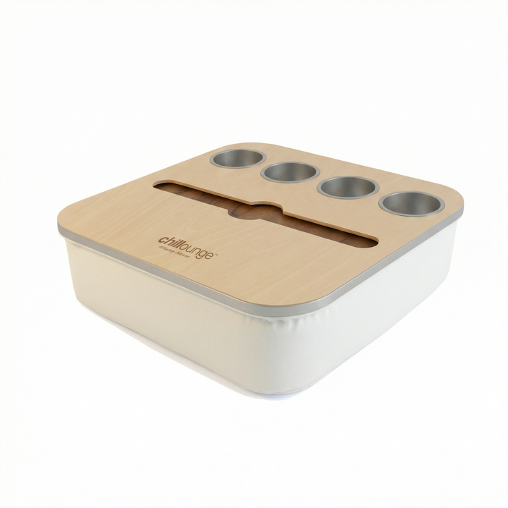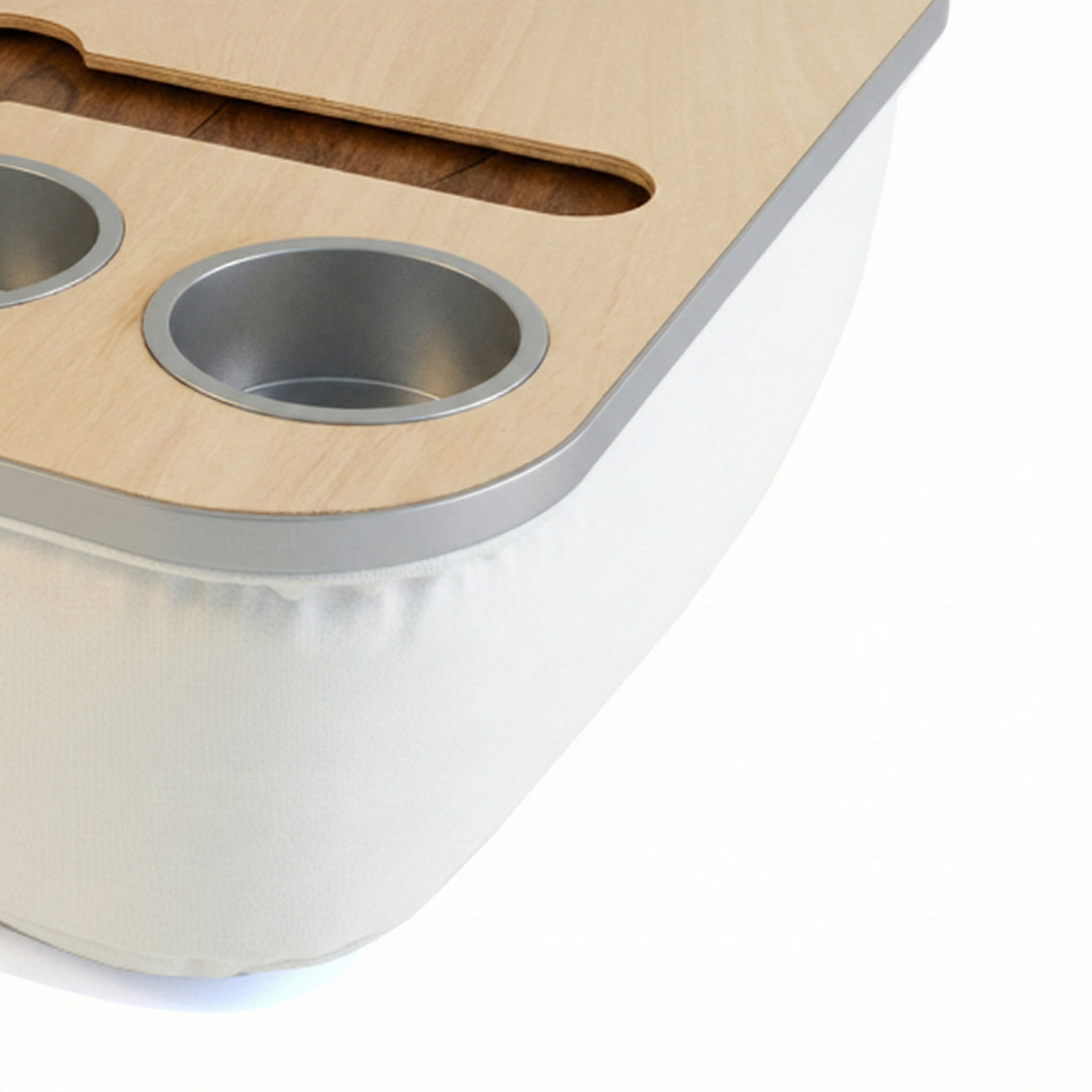 Blending elegance with practicality, the Duo Tray features a beanbag base that adapts to most surfaces, keeping drinks and snacks comfortably within reach. Its anti-slip coated top, metallic gold or silver cupholders, and patented stemware rail create a stable, refined experience that enhances every moment of relaxation.