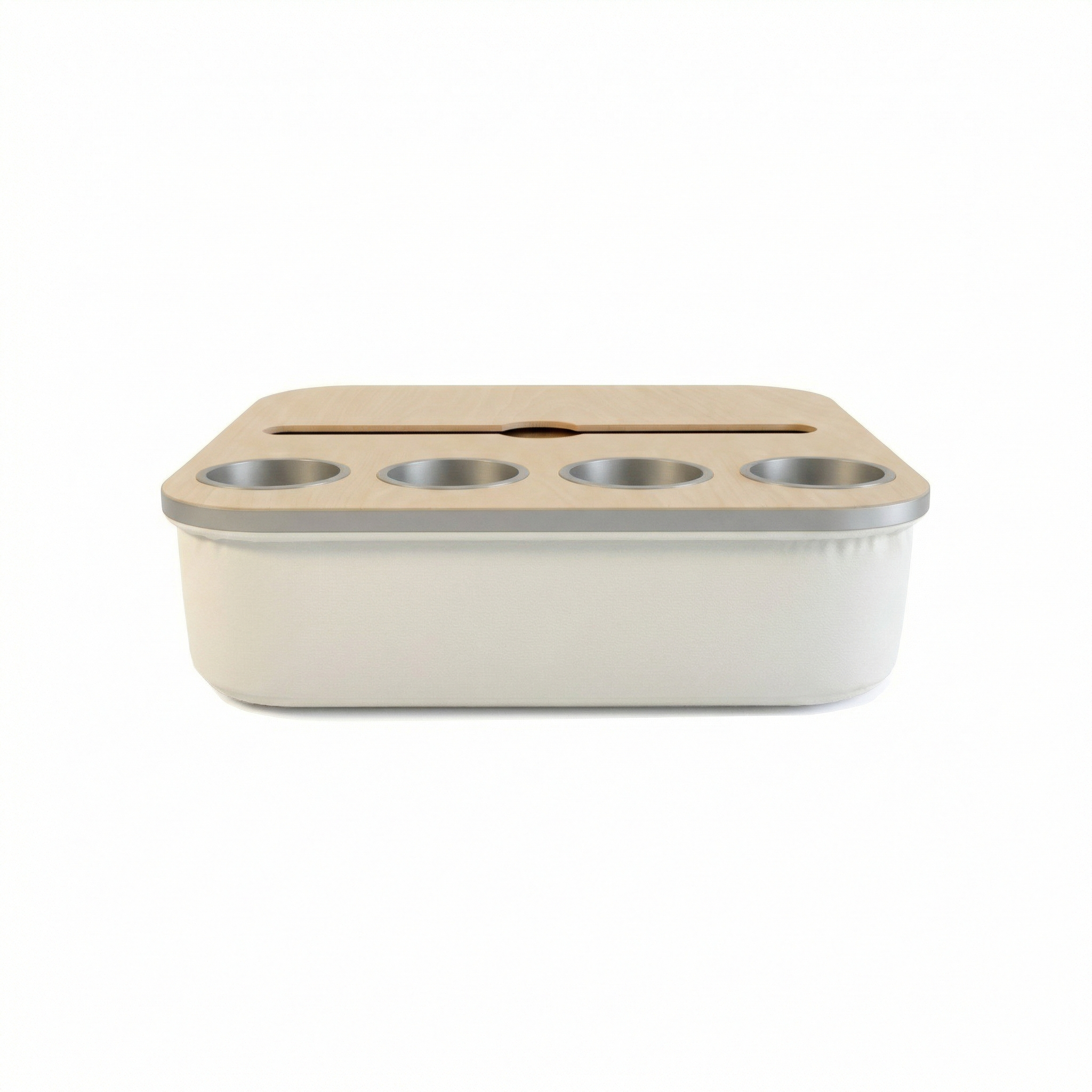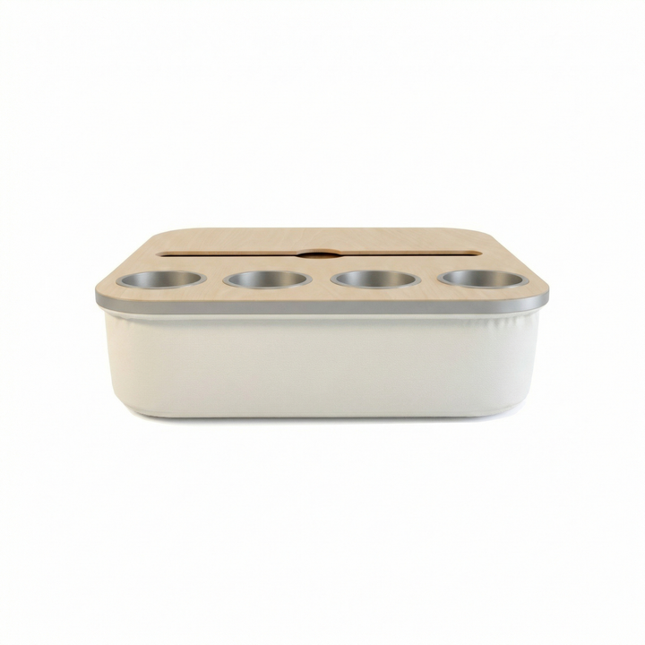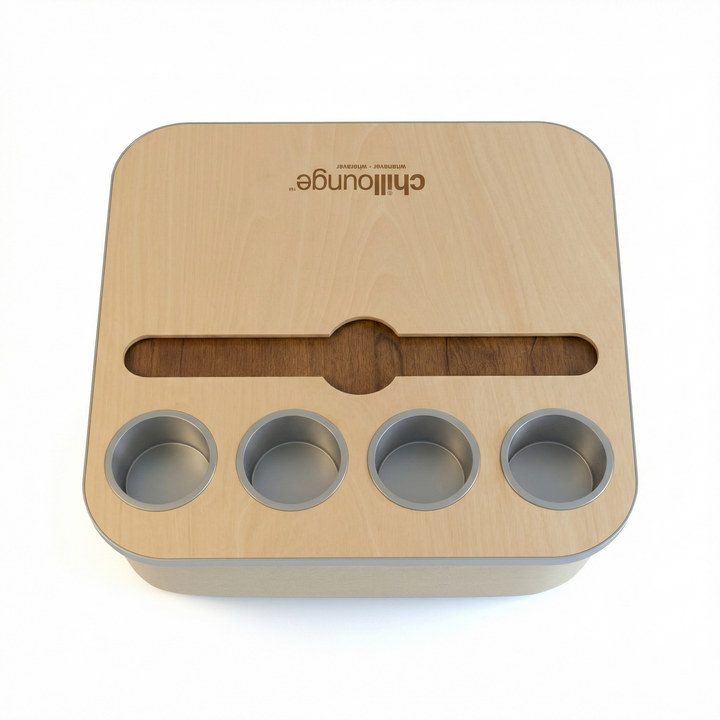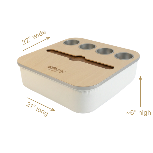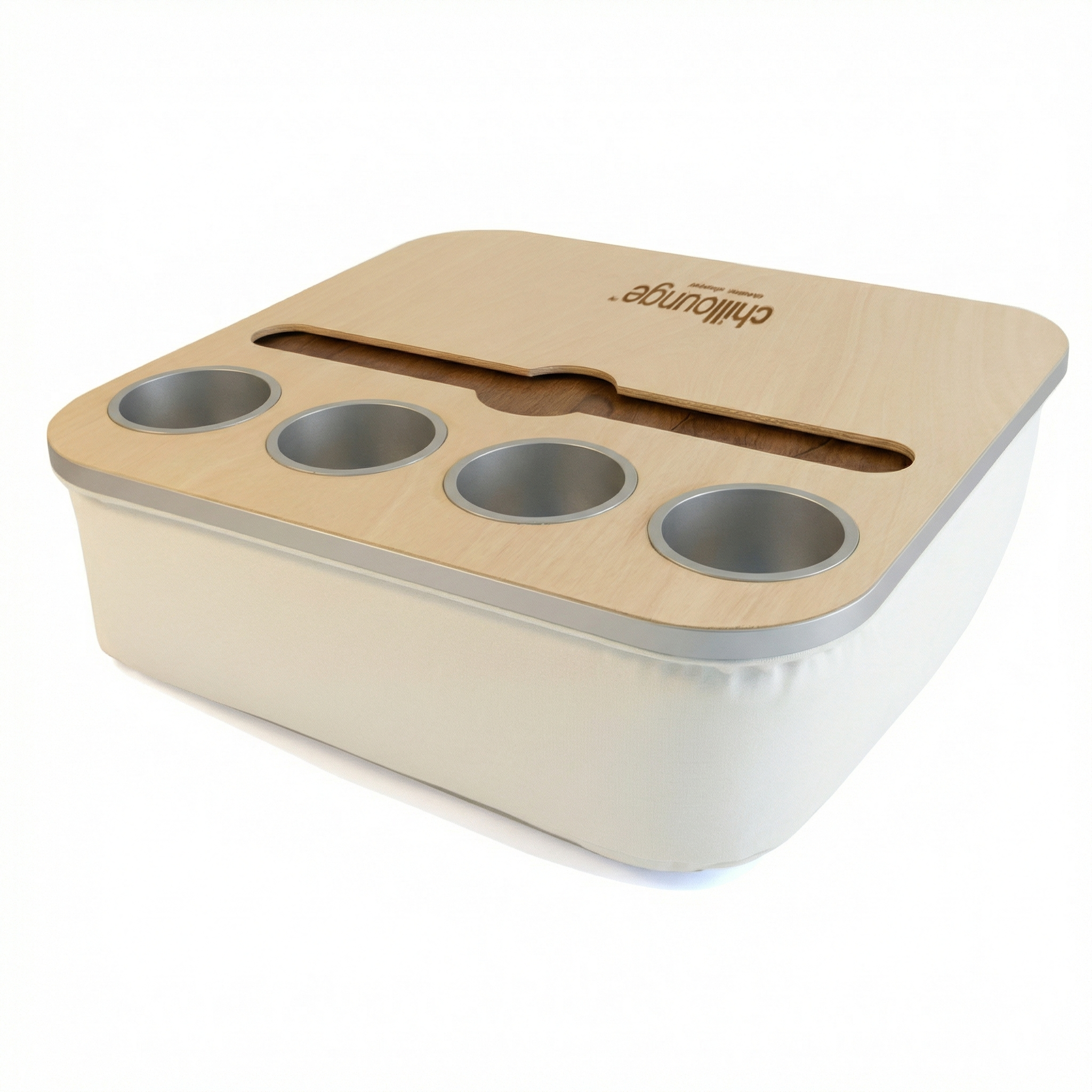 Blending elegance with practicality, the Duo Tray features a beanbag base that adapts to most surfaces, keeping drinks and snacks comfortably within reach. Its anti-slip coated top, metallic gold or silver cupholders, and patented stemware rail create a stable, refined experience that enhances every moment of relaxation.