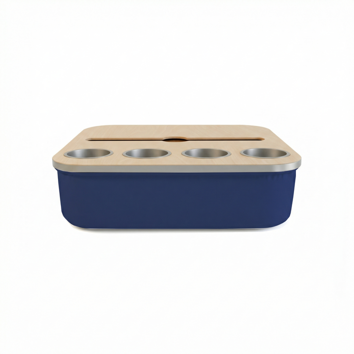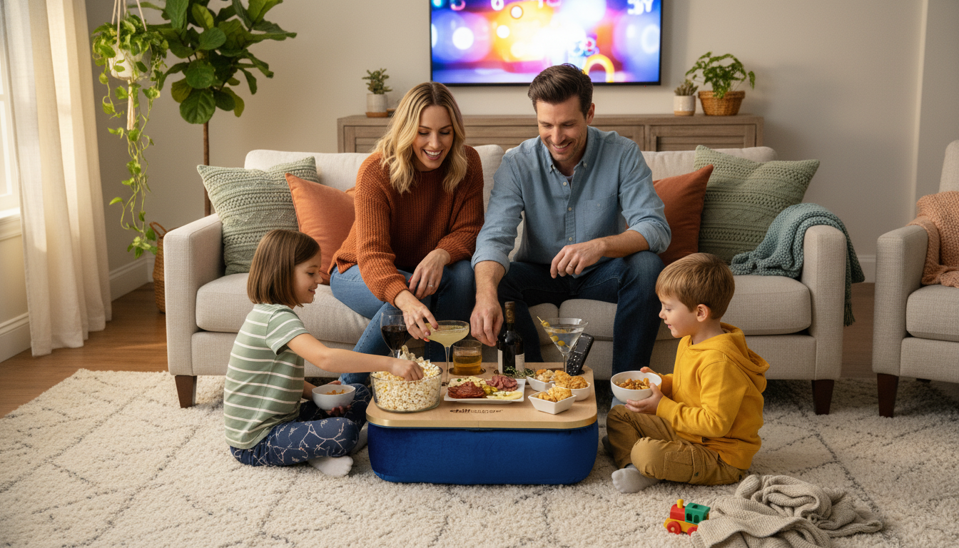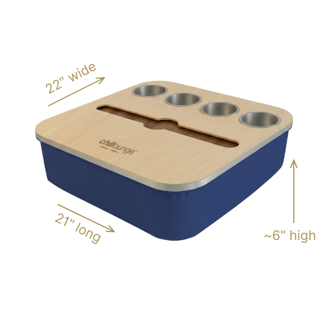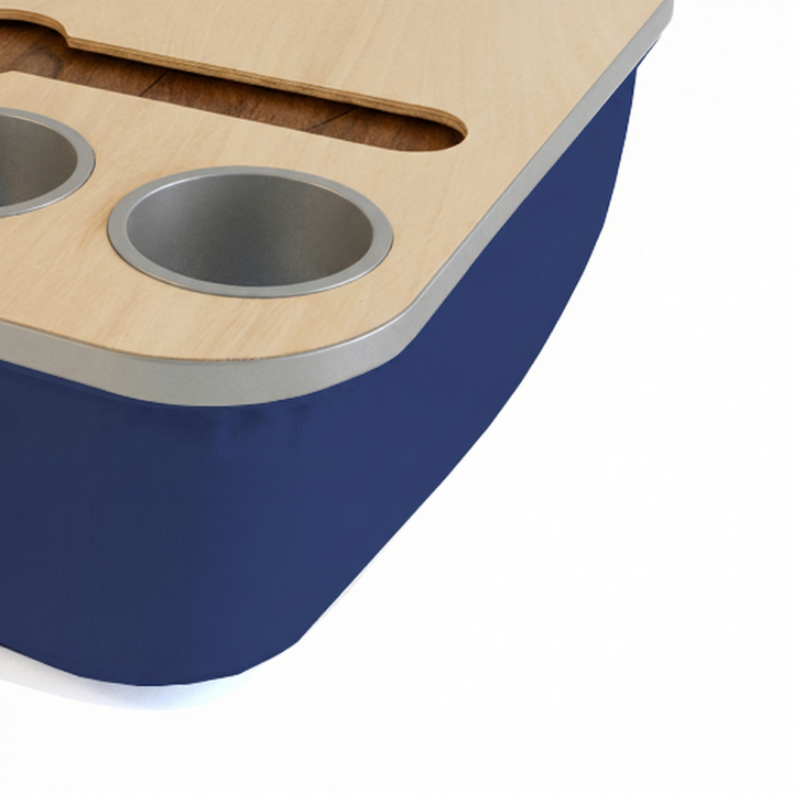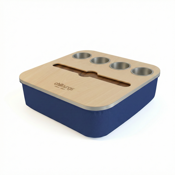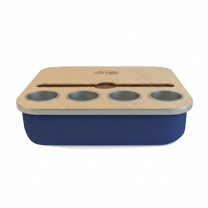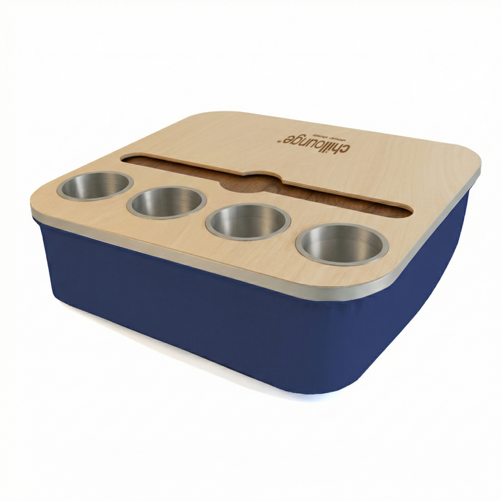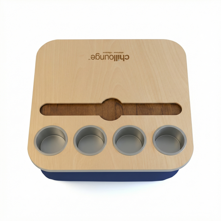 Blending elegance with practicality, the Duo Tray features a beanbag base that adapts to most surfaces, keeping drinks and snacks comfortably within reach. Its anti-slip coated top, metallic gold or silver cupholders, and patented stemware rail create a stable, refined experience that enhances every moment of relaxation.